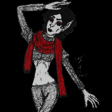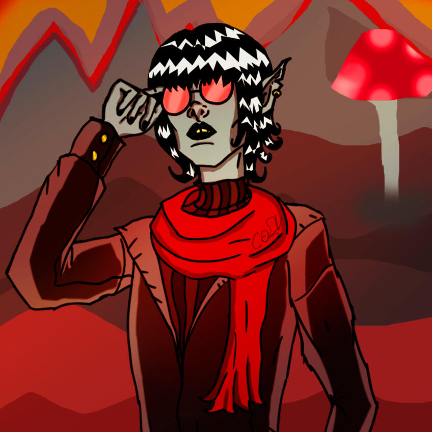 Of average stature for a Dunmer, Anglachel is extremely thin, her body small in comparison to her head; just like a mushroom!Her messy black hair is usually cut in many different layers, giving it a voluminous appearance that alongside her big round glasses that she is rarely seen without give her a characteristic appearance, easily recognizable.Her nose is round and her features delicate, with small lips and gloomy eyes.Anglachel is never without her favorite red scarf, it seems to hold a deep emotional value for her.